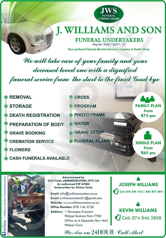 J Williams and Son Funeral Undertakers cc give your family and love ones a dignified funeral service with a Funeral Director that care about you and your love ones....